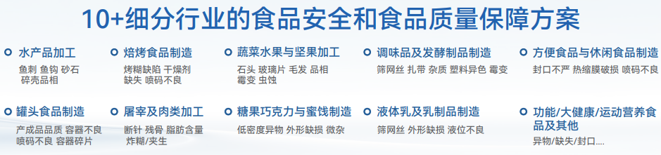 保障系统具备高度定制化与可扩展性,目前已覆盖肉制品、坚果籽仁、冷冻蔬菜等 10 余个细分行业。肉类加工业中常见的断针、残骨、脂肪含量分析等痛点,蔬菜加工业里的石头、毛发、薄片玻璃等异物微杂及品相不良问题,休闲食品领域的封口不良、热缩膜不良、喷码不良等情况,以及更多行业的个性化质量问题,都能通过定制化的保障系统方案逐一解决。