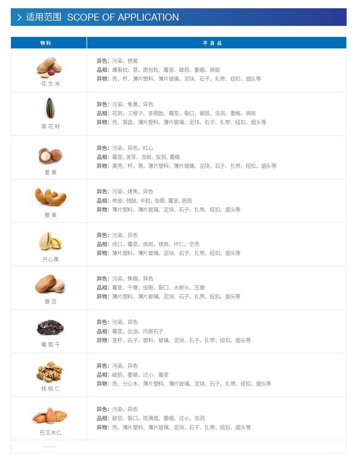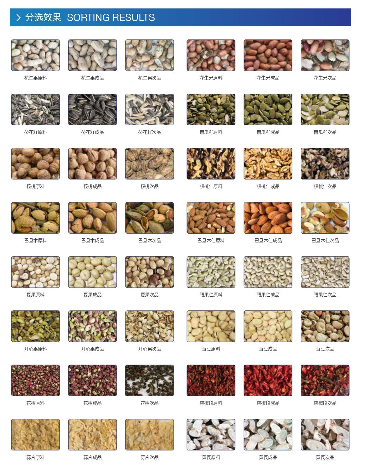 可应用于蔬菜、坚果、籽仁、中草药等行业,例如辣椒、蚕豆、花生等物料,即使应用于粉尘多的分选环境也有稳定分选效果。