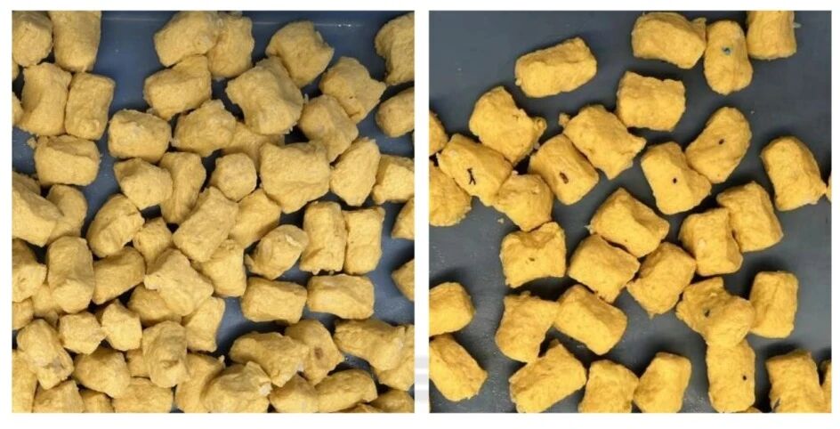 △鱼豆腐分选:左良品,右黑点、破损等不良品