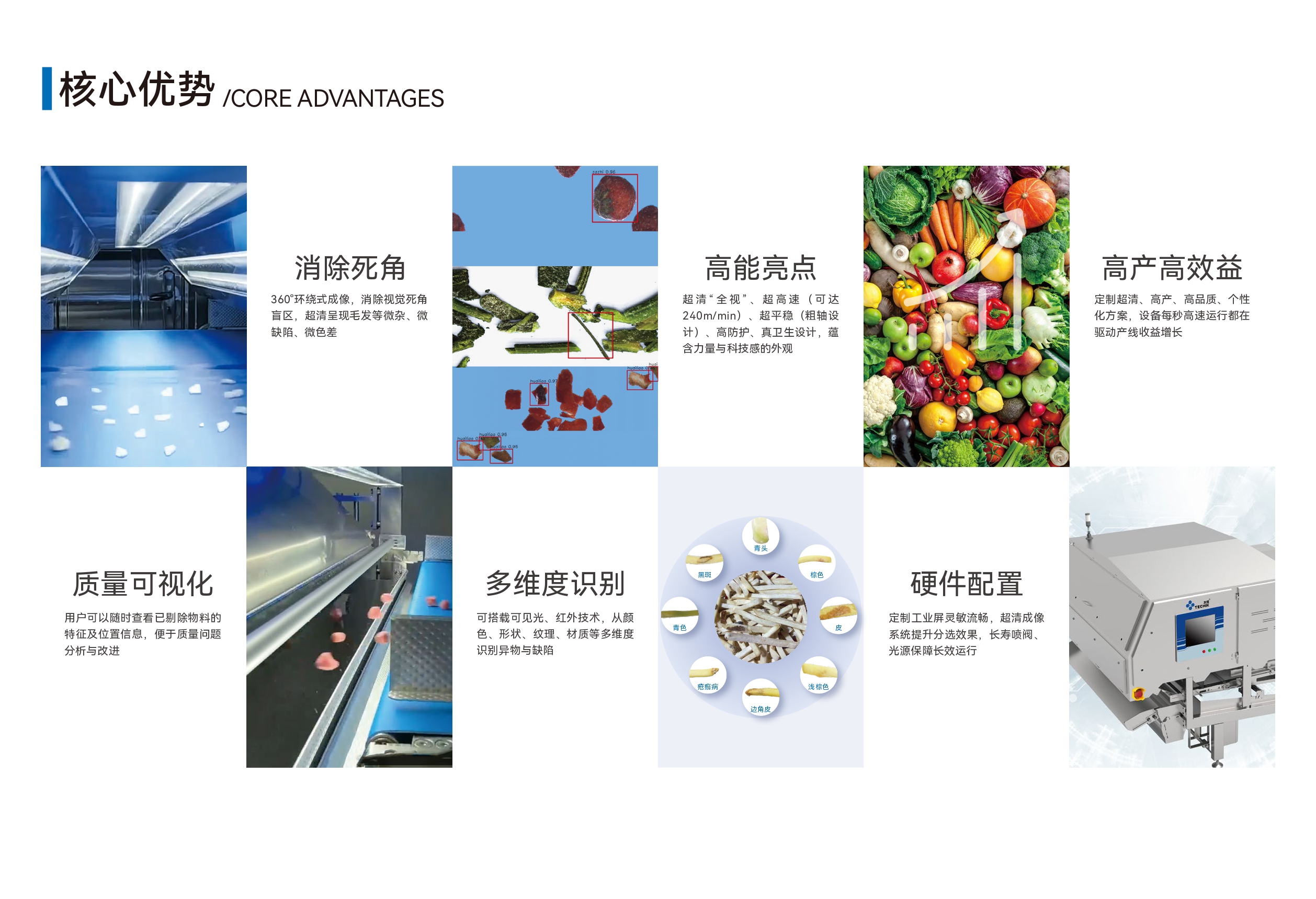 其搭载超清多视角成像与AI智能技术,准确识别毛发级微杂以及微缺陷、微色差,同时采用柔性输送系统,大幅降低物料损伤,助力企业实现高产、高品质、低损耗的加工目标。
